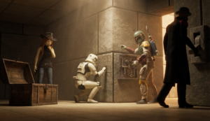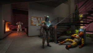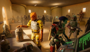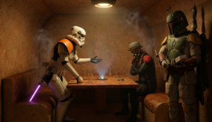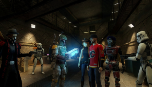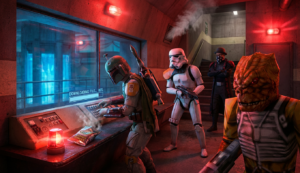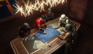 The crew plans their first major heist since reuniting – stealing the original GONK droid prop from a private collector’s vault on Nar Shaddaa.