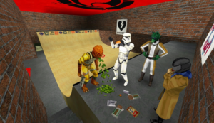 With the physics engine finally stable, the crew returns to their roots: a good old-fashioned pyramid scheme selling fake ‘Force-in-a-Bottle’ to gullible tourists at Club OC.